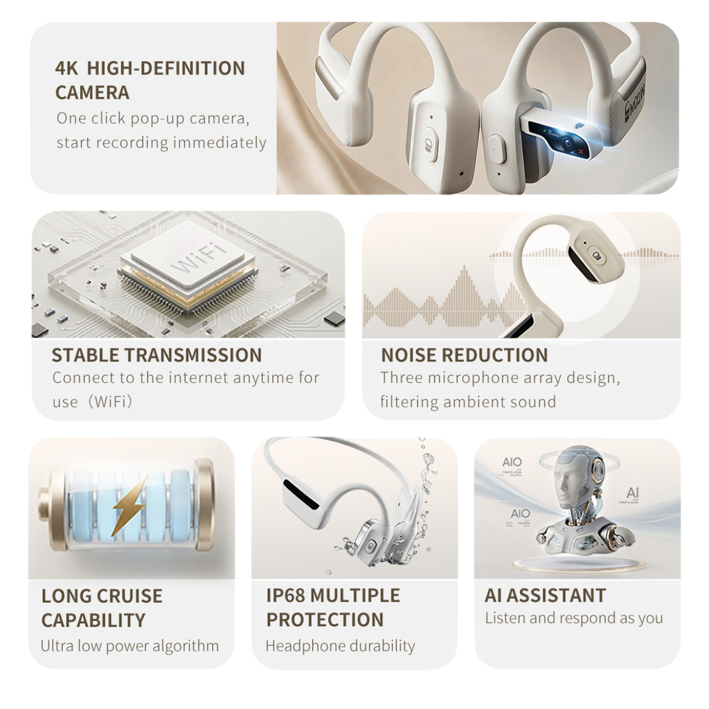 Earphones equipped with camera functionality, boasting a 1080P HD foldable camera. Enjoy music and share your first-person perspective anytime"Listen as u want,Recond as u see."